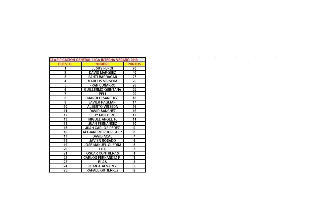 4.2 Acumularán puntos para la clasificación general de la liga, todos los participantes que finalicen la prueba del C.D. OCIOSUR, en función del siguiente baremo: